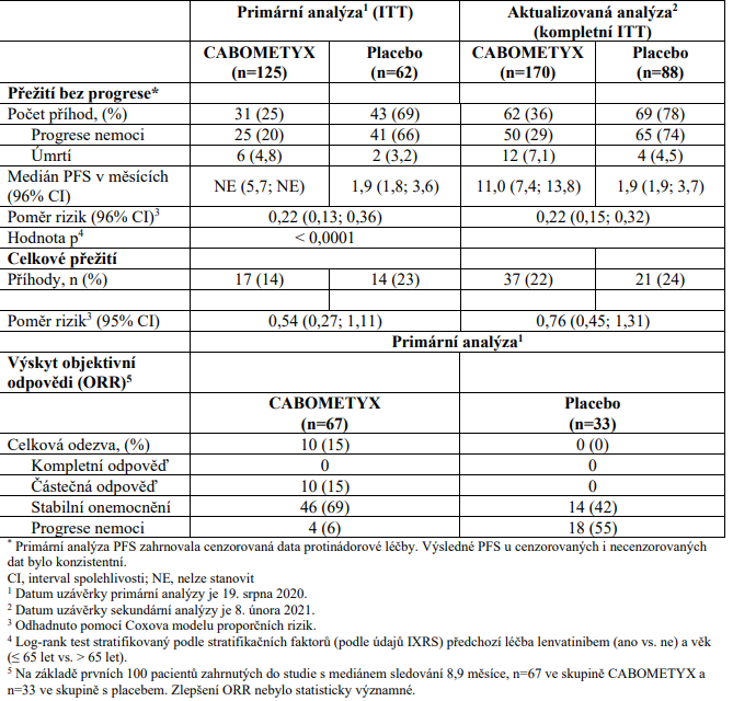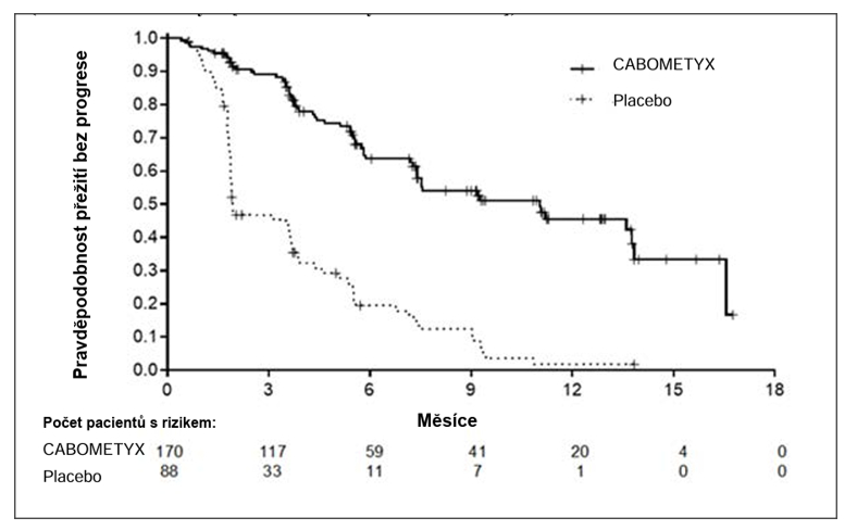 Bezpečnost a účinnost přípravku CABOMETYX byla v hodnocena v randomizované (2:1), dvojitě zaslepené, placebem kontrolované, multicentrické studii (COSMIC-311) u dospělých pacientů s lokálně pokročilým nebo metastazujícím diferencovaným karcinomem štítné žlázy, který progredoval po maximálně dvou předchozích terapiích cílených na VEGFR (lenvatinibu nebo sorafenibu) a byl rezistentní vůči radioaktivnímu jódu nebo pacient vhodný k léčbě radioaktivním jódem. Pacienti s měřitelným onemocněním a dokumentovanou radiografickou progresí byli randomizováni (n=258) k podávání kabozantinibu v dávce 60 mg perorálně jednou denně (n=170) nebo placeba (n= 88). Stratifikačními faktory bylo podání lenvatinibu (ano vs. ne) a věk (≤ 65 let vs. > 65 let). Primárními ukazateli výsledné účinnosti bylo přežití bez progrese (PFS) a výskyt objektivní odpovědi (ORR). Celkové přežití (OS) bylo dalším cílovým parametrem studie. Histologicky mělo 55 % potvrzenou diagnózu papilárního karcinomu štítné žlázy, 48 % mělo folikulární karcinom štítné žlázy, včetně 17 % pacientů s karcinomem štítné žlázy z Hürthleových buněk. Metastázy byly přítomny u 95 % pacientů: v plicích u 68 %, v lymfatických uzlinách u 67 %, v kostech u 29 %, na pohrudnici u 18 % a v játrech u 15 %. Pět pacientů nedostalo předchozí RAI z důvodu nezpůsobilosti, 63 % dříve dostávalo lenvatinib, 60 % dříve užívalo sorafenib a 23 % užívalo sorafenib i lenvatinib. Medián doby léčby byl 4,4 měsíce v rameni s kabozantinibem a 2,3 měsíce v rameni s placebem. Výsledky studie jsou uvedeny v tabulce č. 1. Studie prokázala statisticky významné zlepšení PFS (medián sledování 6,2 měsíce) u pacientů randomizovaných k léčbě kabozantinibem (n=125) ve srovnání s placebem (n=62) (graf č.1).