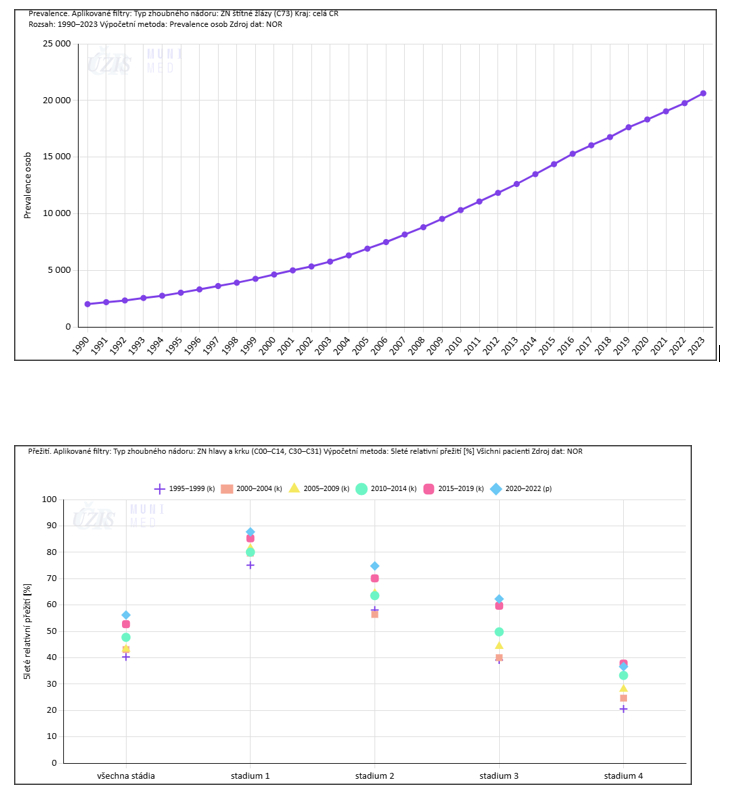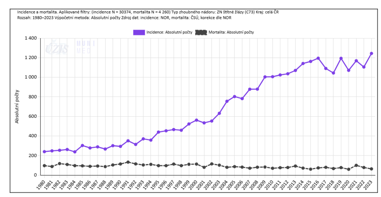 V České republice se výskyt karcinomů štítné žlázy od počátku 80. let zvýšil čtyřikrát. V roce 2023 bylo v České republice diagnostikováno nově 1244 případů nádorů štítné žlázy, oproti 262 případům v roce 1983 (obrázek 1-3). Dochází též k jednoznačnému nárůstu nově diagnostikovaných nemocných v prvním stádiu. Vysoký nárůst incidence je též dáván do souvislosti s lepší dostupností diagnostických metod. Zároveň dochází k prodloužení přežívání nemocných s touto diagnózou, včetně nemocných s metastatickým onemocněním. Diferencované karcinomy štítné žlázy (DTC) jsou nejčastějšími malignitami, následované, medulárním karcinomem a anaplastickým karcinomem a primárními lymfomy štítné žlázy. Nejčastějšími histologickými typy jsou papilární karcinom, který představuje 84% všech nádorů štítné žlázy, následuje folikulární karcinom 4%, onkocytární karcinom 2%, dediferencovaný karcinom 5%, anaplastický karcinom 1% a medulární karcinom 4%. Více jak 80% nádorů je menší než 2 cm a v minulosti nebyly často vůbec diagnostikovány.