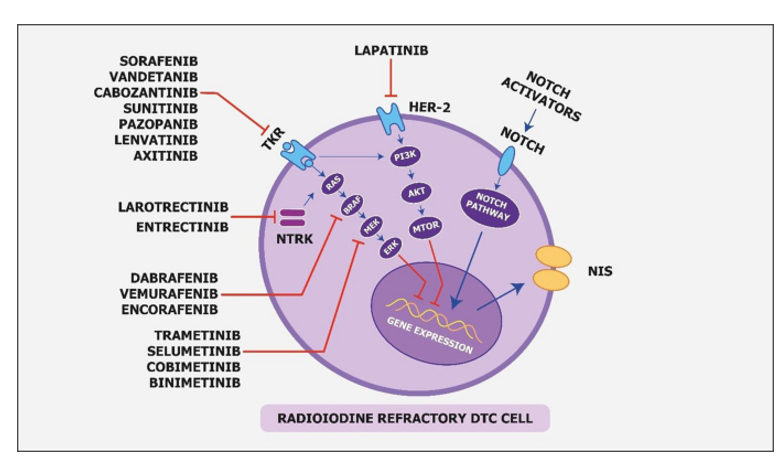Nové poznatky v oblasti nádorové biologie a genetiky otevřely možnosti vývoje nových léčebných molekul cílené tumor-agnostické terapie i pro tento vzácný typ nádorů. Pro léčbu diferencovaných RAI-R karcinomů jsou již několik let používány inhibitory tyrosinkináz - sorafenib a lenvatinib. Kabozantinib byl v roce 2022 registrován též pro léčbu diferencovaných karcinomů u nemocných, kteří podstoupili již jednu nebo dvě linie systémové terapie. Pro nádory s alterací RET genu je registrován selperkatinib, léčivé přípravky larotrektinib a entrektinib jsou registrovány pro nádory s NTRK fúzními geny s vyčerpanou standardní léčbou (obrázek č.4).