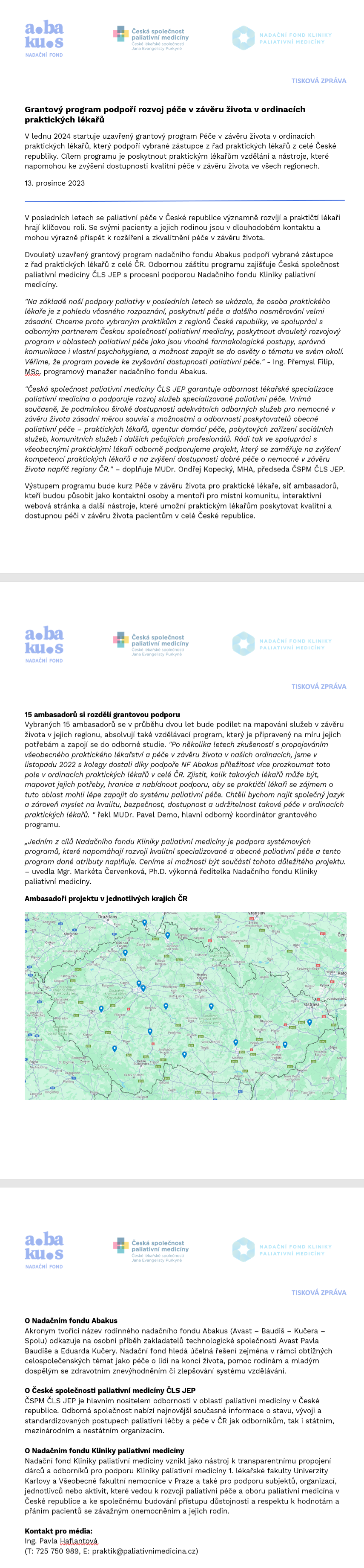 V lednu 2024 startuje uzavřený grantový program Péče v závěru života v ordinacích praktických lékařů, který podpoří vybrané zástupce z řad praktických lékařů z celé České republiky. Cílem programu je poskytnout praktickým lékařům vzdělání a nástroje, které napomohou ke zvýšení dostupnosti kvalitní péče v závěru života ve všech regionech.