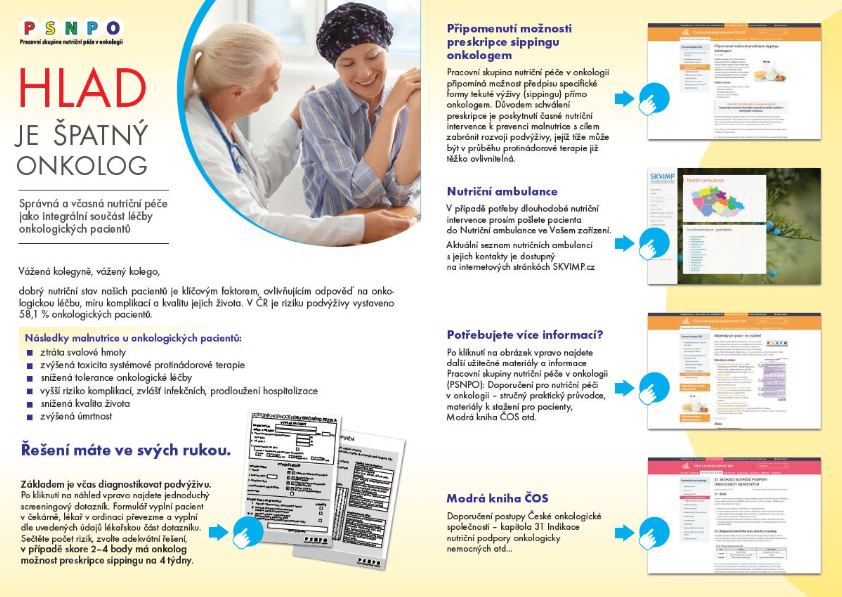 V rámci Pracovní skupiny nutriční péče v onkologii (PSNPO) byl pro Vás připraven přehledný materiál formou odkazovacího letáku, který by Vám měl usnadnit přístup k dokumentům, týkajících se nutriční péče. Stačí kliknout na jednotlivé odkazy, z nichž budete přesměrování na dotazník hodnocení nutričního rizika, podmínky preskripce sippingu, seznam nutričních ambulancí i dostupné informační materiály (jak pro lékaře, tak pro vydání pacientům). Více ZDE