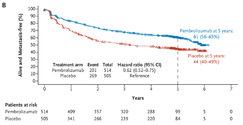 Nenechte si ujít výsledky studie KEYNOTE-054, která sledovala efekt adjuvantního podání pembrolizumabu pacientům s maligním melanomem III. stadia. Po 5letém sledování se při analýze této studie potvrdila přetrvávající superiorita pembrolizumabu ve srovnání s placebem. Přečtěte si detaily.