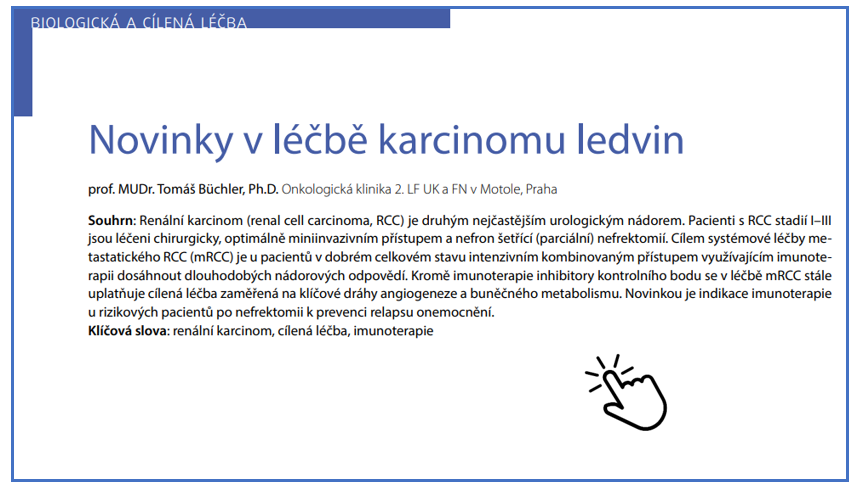 Článek se věnuje problematice aktuálních možností v léčbě renálního karcinomu (renal cell carcinoma, RCC). Jaké prognostické systémy používáme pro klasifikaci nemocných a výběr léčby? Co víme o rozdílu v přežití bez progrese (PFS) a celkovém přežití (OS)? Jaká je doporučená léčba první linie u pacientů se světlobuněčným metastatickým renálním karcinomem? A jak je to s indikací imunoterapie u rizikových pacientů po nefrektomii k prevenci relapsu onemocnění?