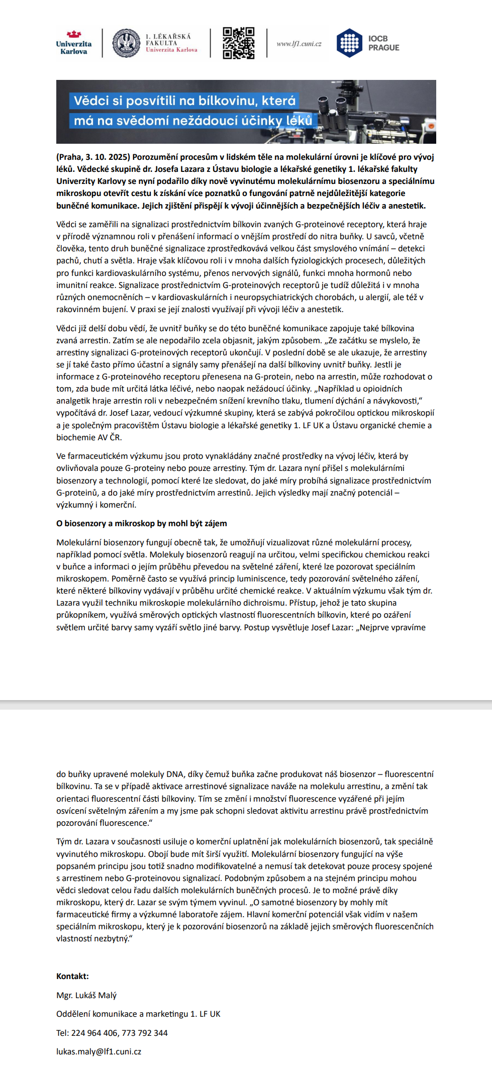 Porozumění procesům v lidském těle na molekulární úrovni je klíčové pro vývoj léků. Vědecké skupině dr. Josefa Lazara z Ústavu biologie a lékařské genetiky 1. lékařské fakulty Univerzity Karlovy se nyní podařilo díky nově vyvinutému molekulárnímu biosenzoru a speciálnímu mikroskopu otevřít cestu k získání více poznatků o fungování patrně nejdůležitější kategorie buněčné komunikace. Jejich zjištění přispějí k vývoji účinnějších a bezpečnějších léčiv a anestetik.