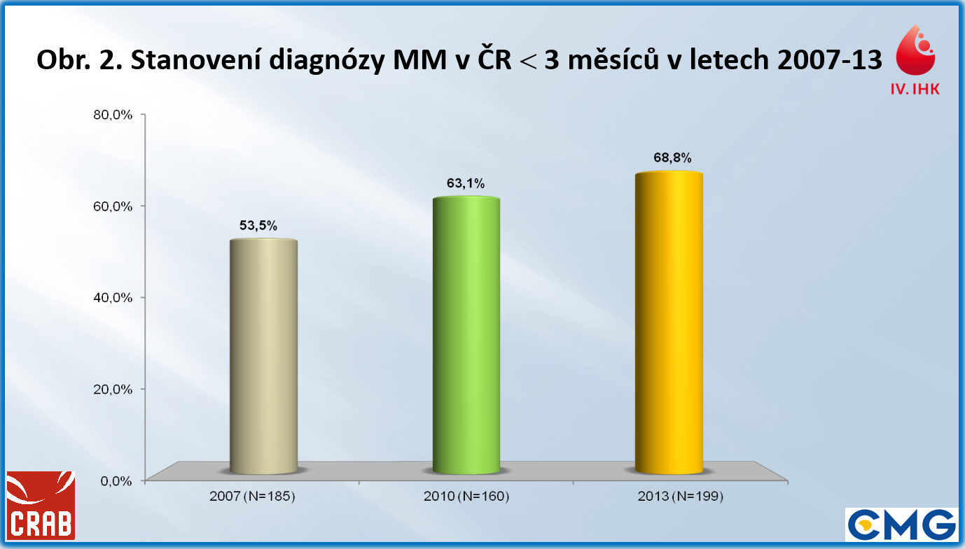 Původní projekt CRAB byl zahájen v dubnu 2007 průzkumem znalostí lékařů o diagnostice a léčbě mnohočetného myelomu. Téměř 70 procent z nich odpovědělo, že se ve své ordinaci již pacientem s MM setkalo. Prakticky všichni přitom měli technické možnosti zajistit základní vyšetření, nicméně u více než poloviny pacientů byla diagnóza MM stanovena pozdě, tj., déle než za 3 měsíce od prvních příznaků onemocnění (viz Obr. 2).