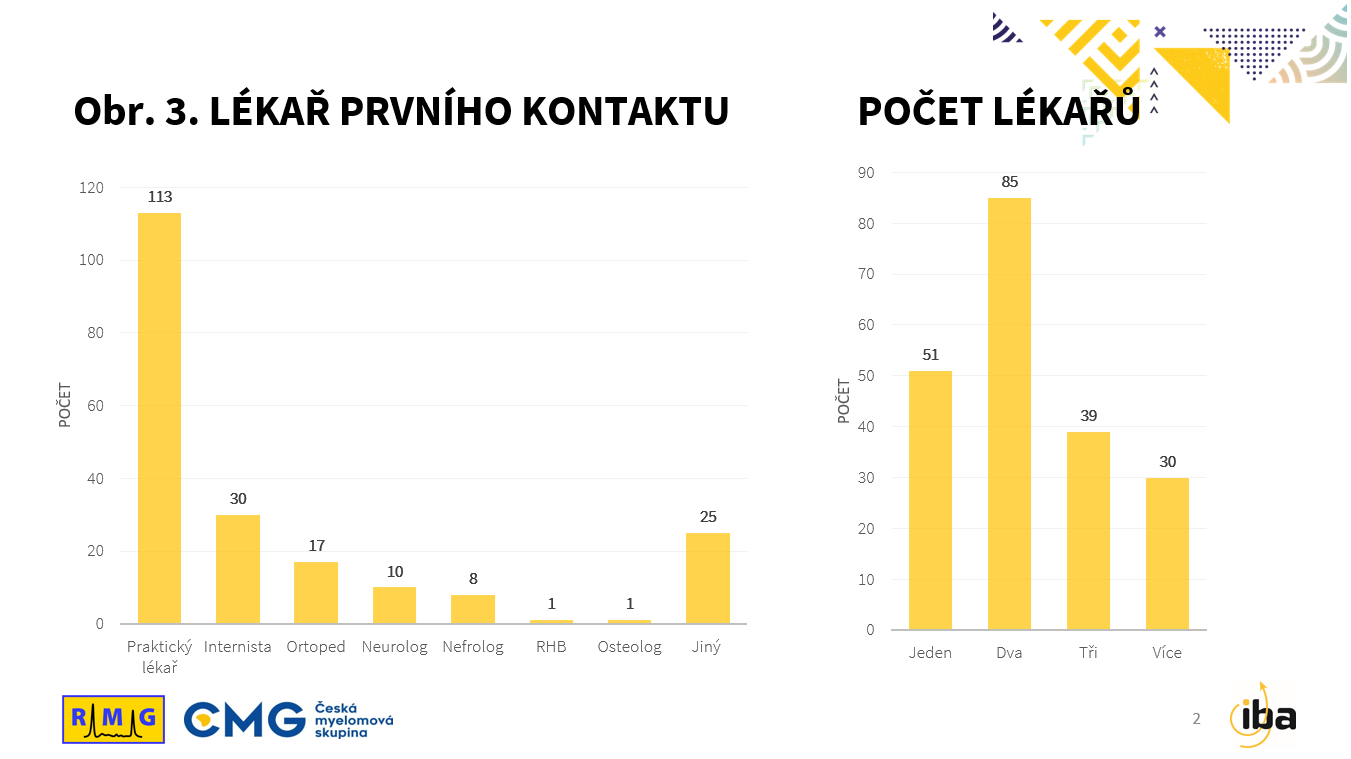 Celkově bylo vyhodnoceno 205 (95,3 %) dotazníků z 215 odevzdaných, když 10 dotazníků bylo pro různé nesrovnalosti z hodnocení vyřazeno. Mezi zúčastněnými pacienty mírně převažovali muži, kterých bylo 114 (55,6 %), medián věku všech pacientů byl 69 let. Nejčastějšími prvními příznaky byly u 77 % nemocných nepřekvapivě bolesti v zádech, následované únavou a dušností. Prvním lékařem, na kterého se pacienti se svými obtížemi obraceli, byl v 55 % jejich praktický lékař. Pacient byl před stanovením diagnózy MM hematologem vyšetřen nejčastěji dvěma lékaři jiných odborností a to ve 42 % případů (viz Obr. 3).