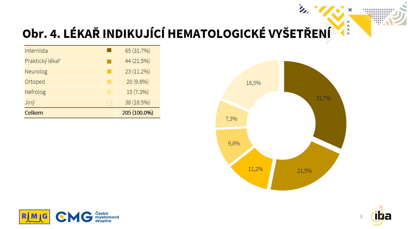 Kromě svého praktického lékaře pacienti pro své obtíže nejčastěji navštívili nebo byli odesláni k internistovi, ortopedovi, neurologovi nebo nefrologovi. Lékařem indikujícím hematologické vyšetření pro podezření na MM byl nejčastěji internista a to u 65 (31,7 %) nemocných, následovali praktický lékař, neurolog a ortoped (viz Obr. 4).