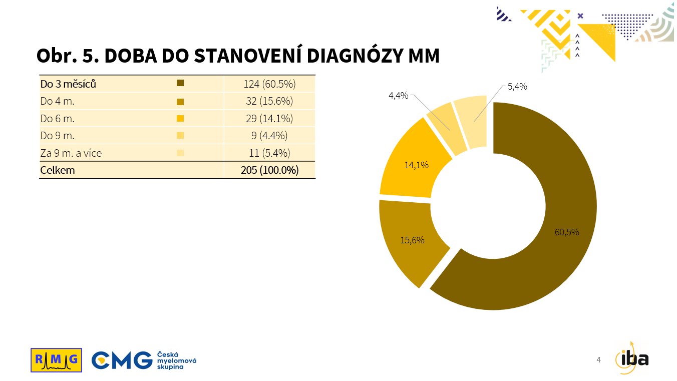 Hlavním cílem projektu CRAB II bylo zjištění intervalu, který uplynul od prvních příznaků onemocnění do stanovení diagnózy mnohočetného myelomu. Zde se bohužel potvrdil náš dojem o trvajících problémech, když do 3 měsíců byla stanovena diagnóza jen u 124 (60,5 %), do 4 měsíců u 32 (15,6 %) a do 6 měsíců u dalších 29 (14,1 %) nemocných. U cca 10 % nemocných byla diagnóza mnohočetného myelomu stanovena až po více než 6 měsících od prvních příznaků onemocnění (viz Obr. 5).